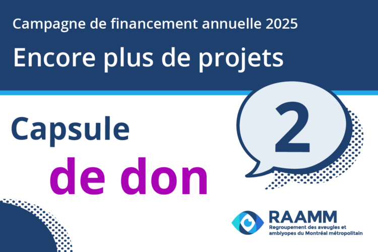 Campagne de financement 2025 : Encore plus de projets – Mardi je donne Le RAAMM, fier partenaire du mouvement mondial Mardi je donne Montréal, le 2 décembre 2025 – Le Regroupement des aveugles et amblyopes du Montréal métropolitain (RAAMM) est…