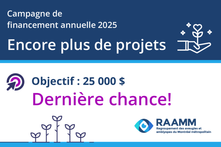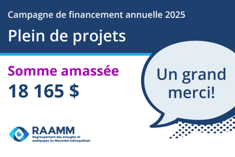 Montréal, le 5 novembre 2025 – Le conseil d’administration et l’équipe du Regroupement des aveugles et amblyopes du Montréal métropolitain (RAAMM) annoncent officiellement le lancement de la campagne de financement annuelle 2025, placée sous le thème Encore plus de projets….