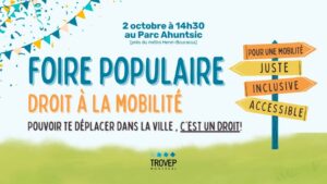 Le comité mobilité de la TROVEP de Montréal vous invite à une foire populaire sur le thème du droit à la mobilité avec des groupes populaires et communautaires de tous les horizons le 2 octobre au parc Ahuntsic, 10555 Rue Lajeunesse, Montréal